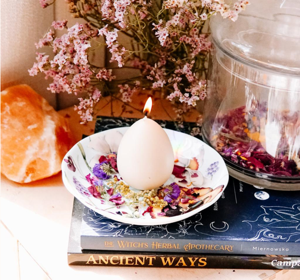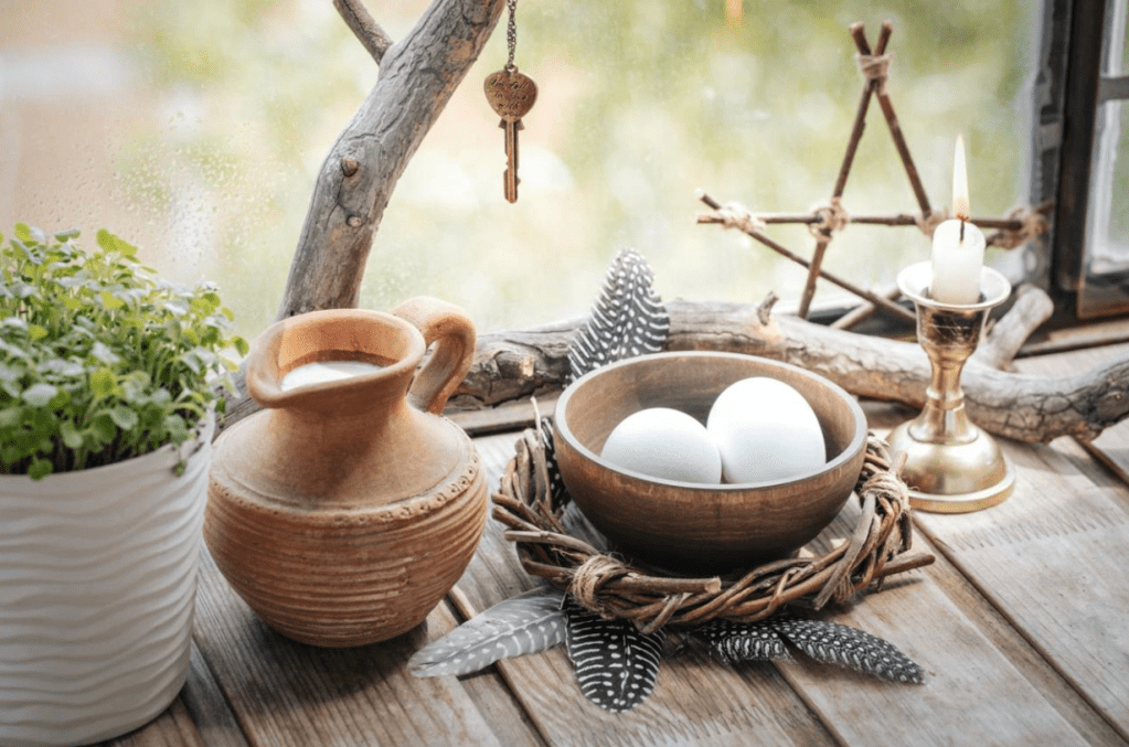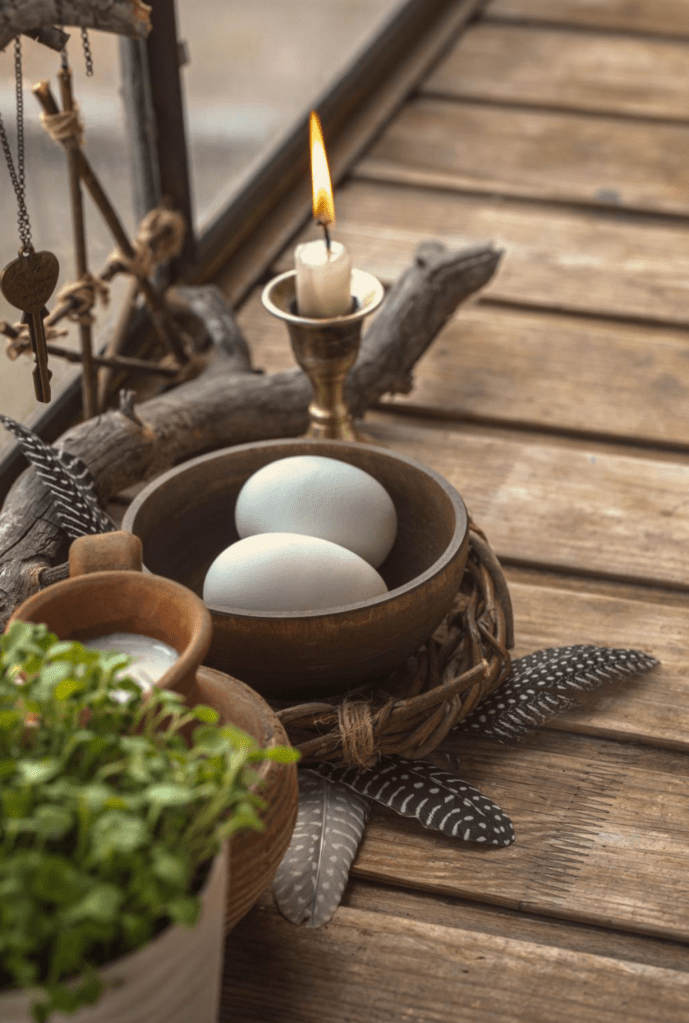 Flowers symbolize new life, beauty, and growth. Choose blooms like tulips, daisies, cherry blossoms, or whatever is local to your area. Even a single flower in a jar can shift the entire energy of your altar.